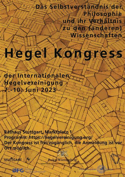 Der Hegel Kongress der Internationalen Hegelvereinigung fand vom 07.-10. Juni 2023 in Stuttgart (Rathaus Stuttgart, Marktplatz 1) statt. Gesponsert wurde er von der DFG, der Stadt Stuttgart, dem Ministerium für Wissenschaft, Forschung und Kunst des Landes Baden-Württemberg und der Frauenförderung des Fachbereichs Philosophie und Geisteswissenschaften der Freien Universität Berlin. Der Kongress wurde organisiert von Julia Christ, Barbara Dober, Dina Emundts, Franck Fischbach, Gunnar Hindrichs, Luca Illetterati, Karen Koch, Yannick Nordwald, Dirk Quadflieg, Robert Stern und Christina Vollmer.